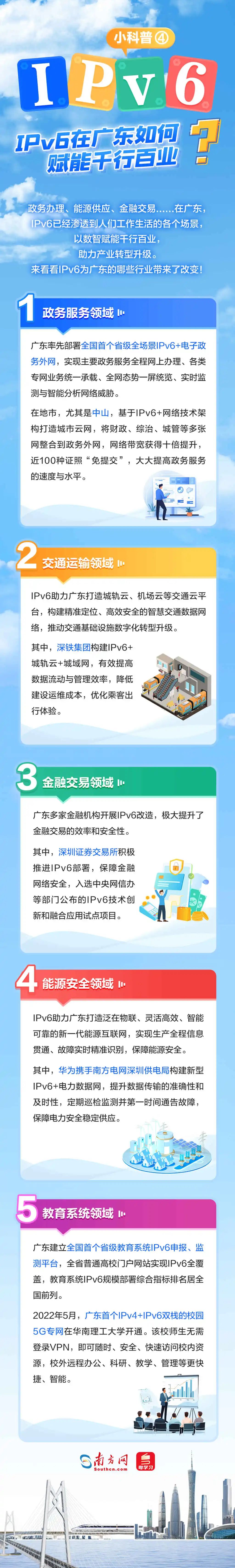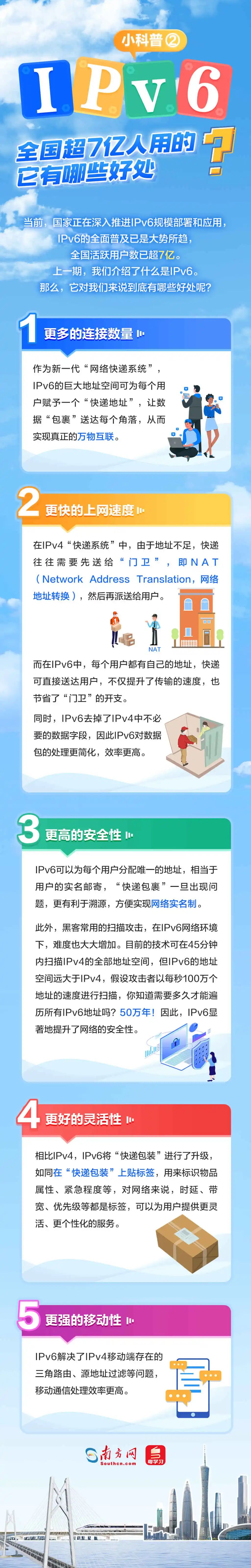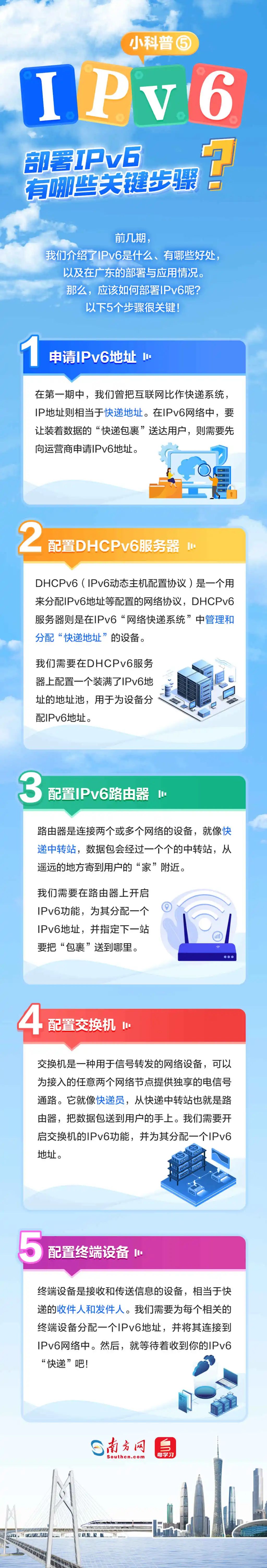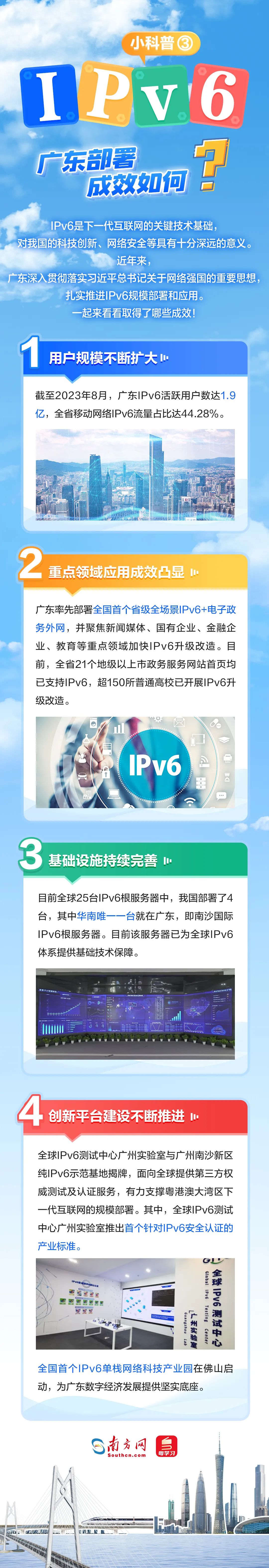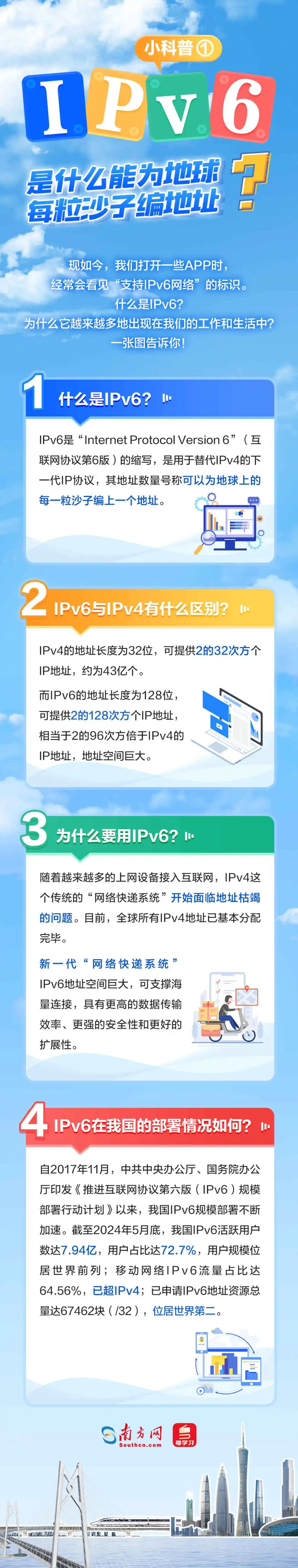 2024年是習(xí)近平總書記提出網(wǎng)絡(luò)強(qiáng)國戰(zhàn)略目標(biāo)10周年,也是我國全功能接入國際互聯(lián)網(wǎng)30周年。作為下一代互聯(lián)網(wǎng)的基礎(chǔ),IPv6的規(guī)模部署和應(yīng)用是網(wǎng)絡(luò)安全能力強(qiáng)化的迫切需要,可為網(wǎng)絡(luò)強(qiáng)國建設(shè)提供有力支撐。近年來,廣東IPv6規(guī)模部署取得良好效果,積極賦能千行百業(yè)加快形成新質(zhì)生產(chǎn)力。 什么是IPv6?它對我們來說有哪些好處?廣東IPv6部署取得了哪些成效,為哪些行業(yè)帶來了改變?部署IPv6又有哪些關(guān)鍵步驟?5張圖帶你看懂這個能為地球每粒沙子編地址的神奇技術(shù)!